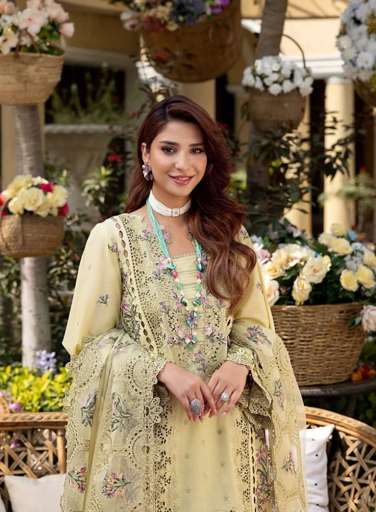 ELAF - 3PC Yellow LAWN CHIKANKARI EMBROIDERED SHIRT WITH KHAADI NET EMB DUPATTA AND EMB TROUSER