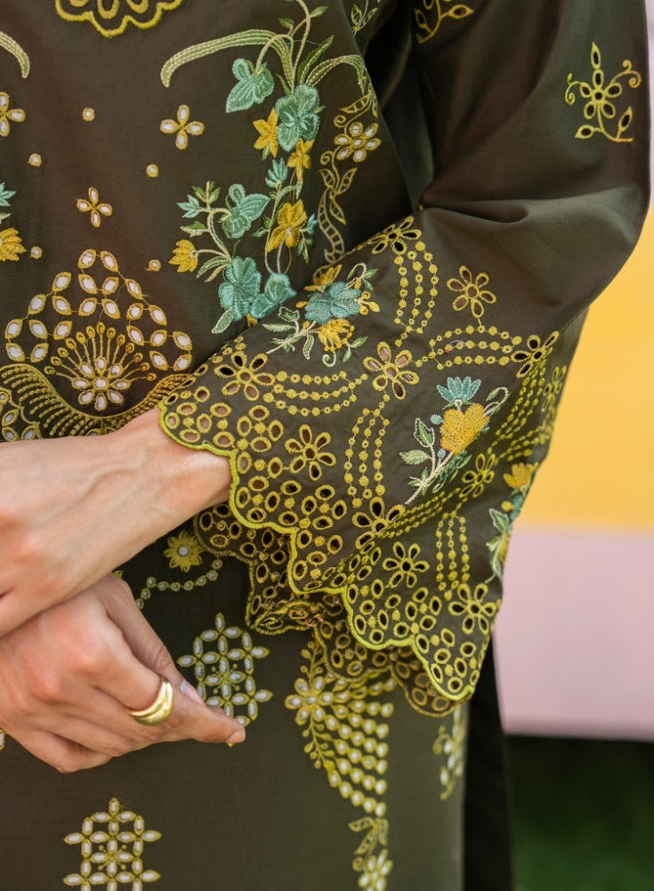 MIRAKHI - 3PC mehandi LAWN EMBROIDERED SHIRT WITH CHIFFON PRINTED DUPATTA AND TROUSER