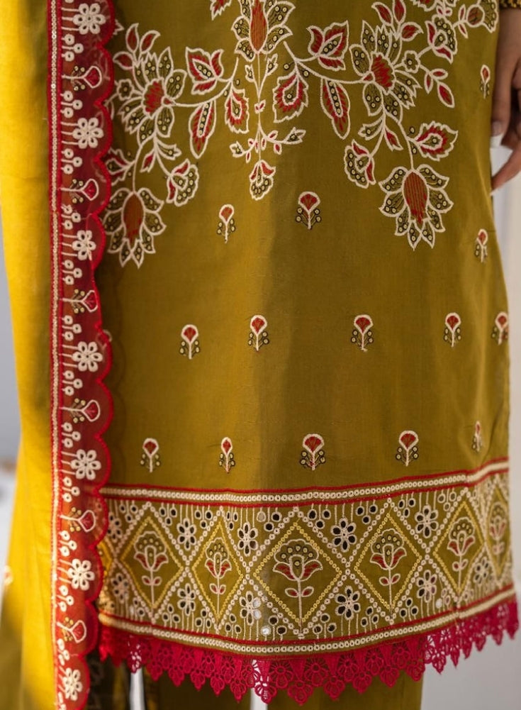 SoftStitch - 3PC Mehandi LAWN EMBROIDERED SHIRT WITH LAWN EMBROIDERED READY TO WEAR DUPATTA